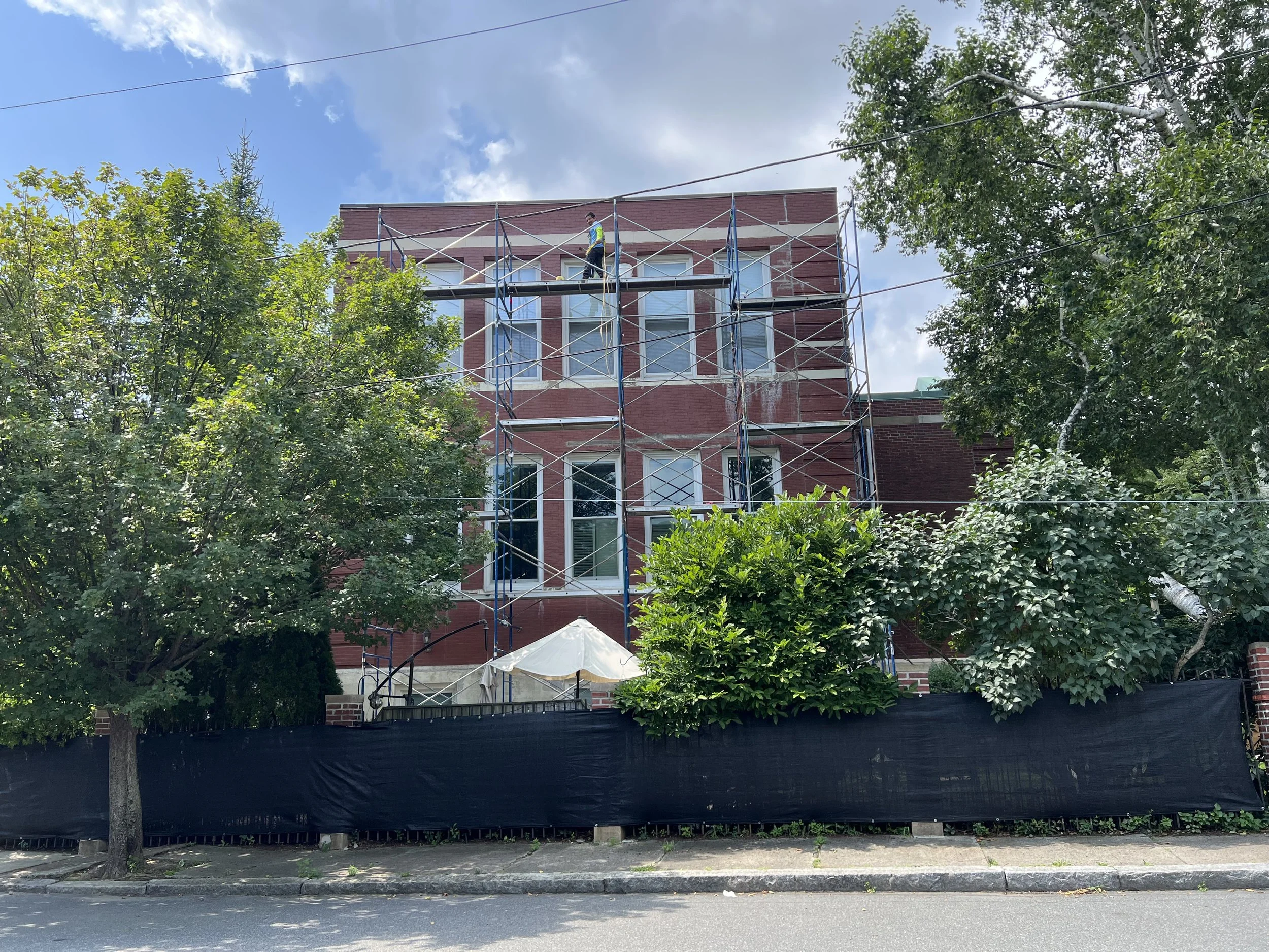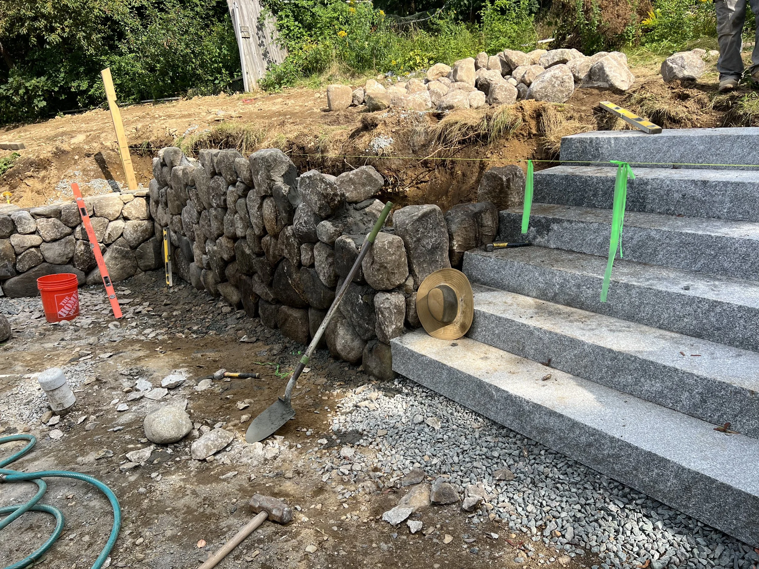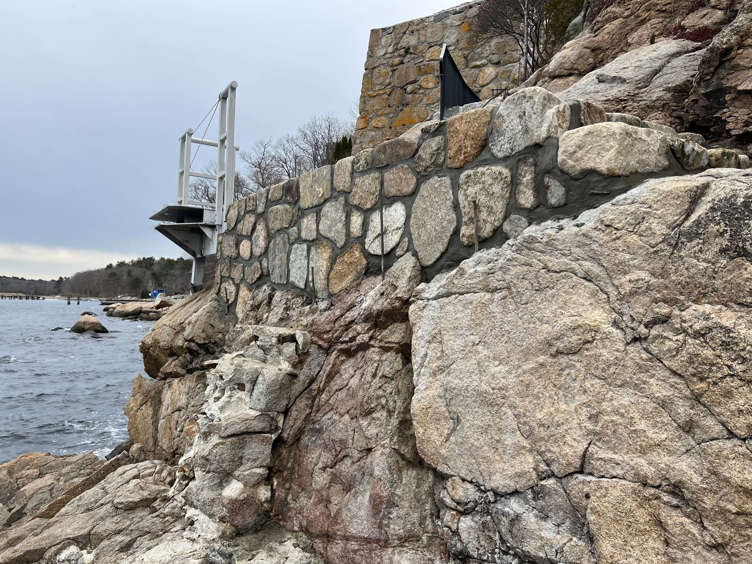 Sheridan Condominiums - Brick Repointing & Painting Stairs and Stone Retaining Wall Chimney and Roof Reconstruction New Cement Patio New Front Landing and Steps New Sidewalk at Elementary School Ocean Retaining Wall Stone Fireplace Repair